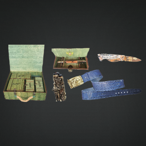 В набор входит: Складной нож, Ручка «Пуля», кожаный ремень, памятный знак «Воин», зажигалка.